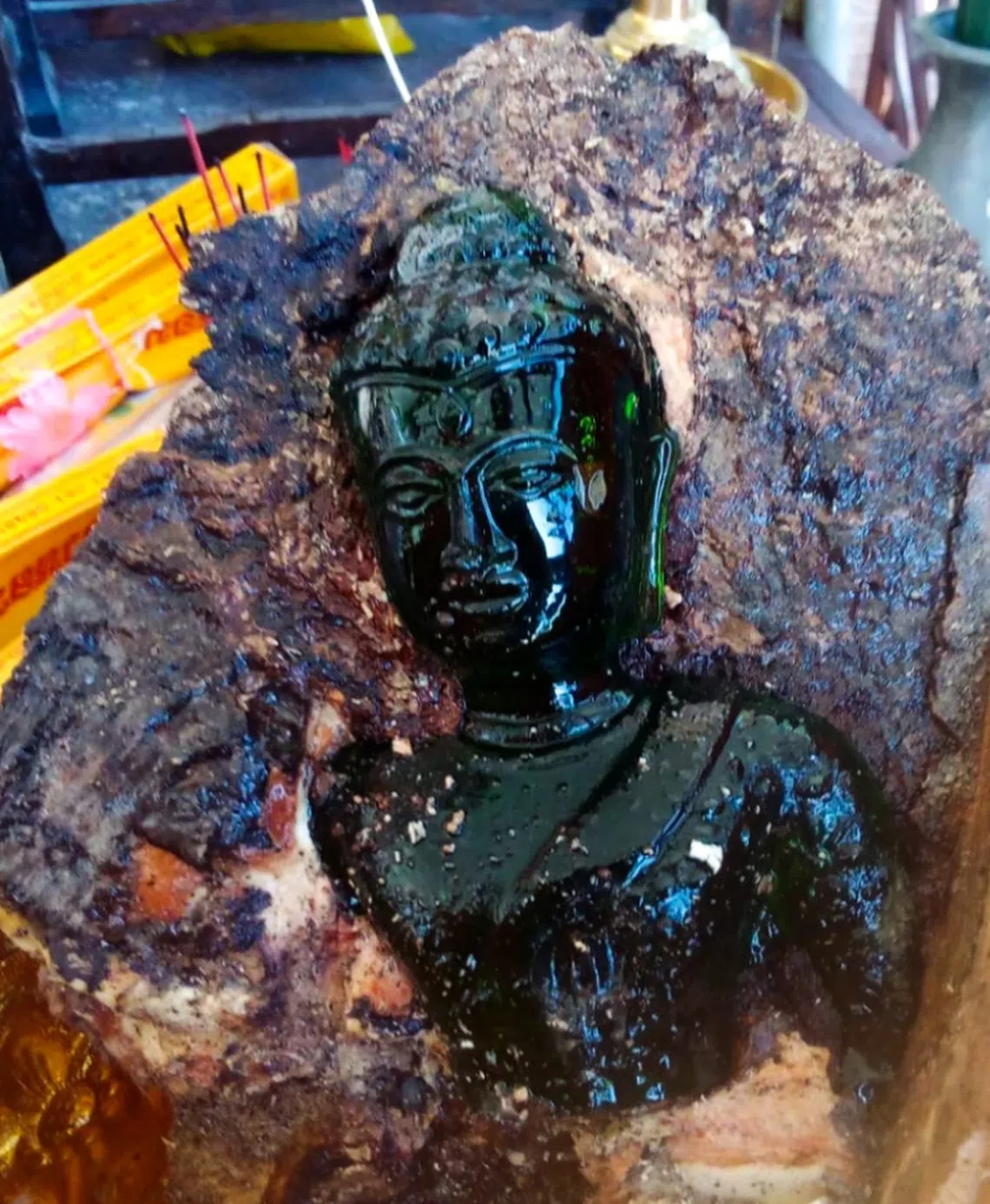 While cutting down a 10m-tall mango tree, whose trunk measured 80cm in diameter, the tree cutter stumbled upon a small emerald Buddha statue within the tree’s trunk.