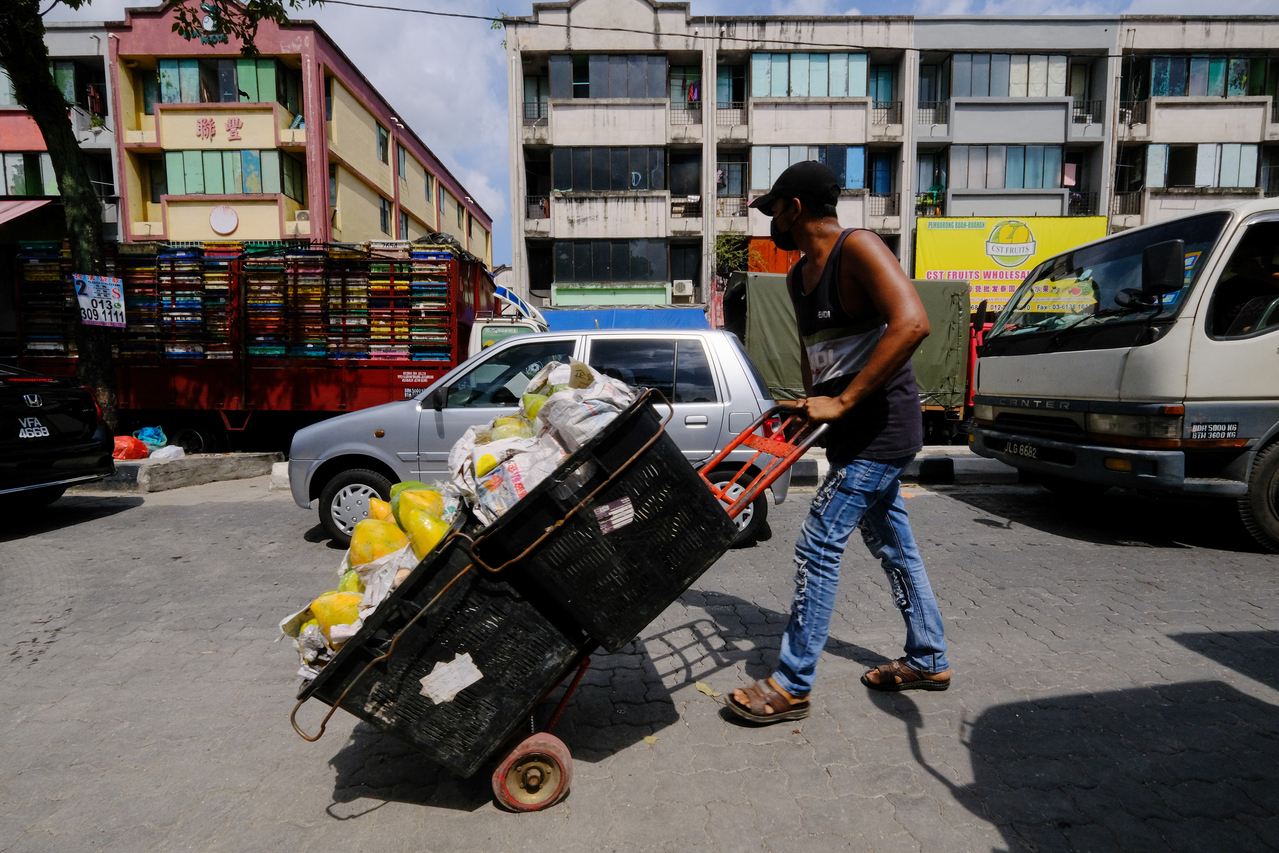 A worker wheels crates of produce on a trolley at the Pasar Borong Selayang wet market in Selayang, Malaysia, on June 21, 2021.