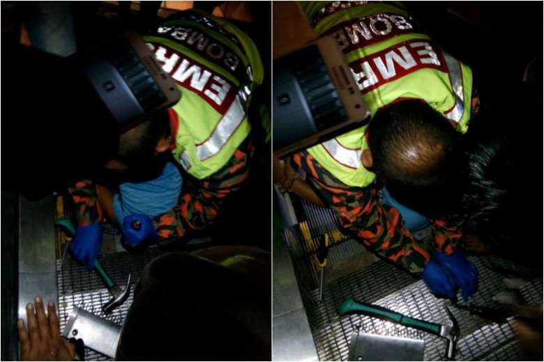 Officers from Malaysia's Emergency Rescue Service team working to free the boy from the escalator.