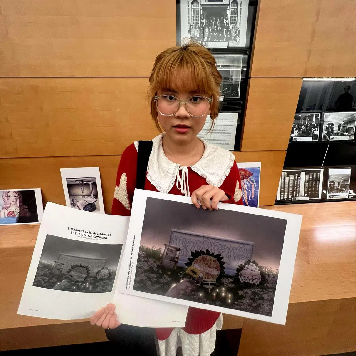 Benjamaporn Nivas shows artwork she created in Canada about the Thai political situation.