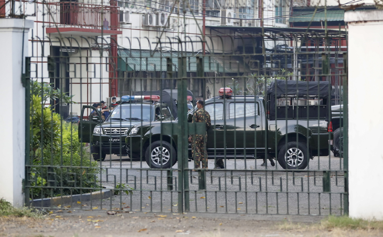 Military soldiers and vehicles are seen inside the state-run Myanmar Radio and Television office compound, in Yangon, on Feb 1, 2021.