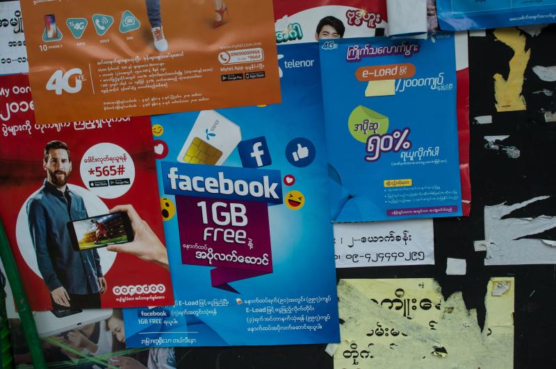 The Facebook logo is seen on an advertisement by a local telecom company in Yangon on June 7, 2018.