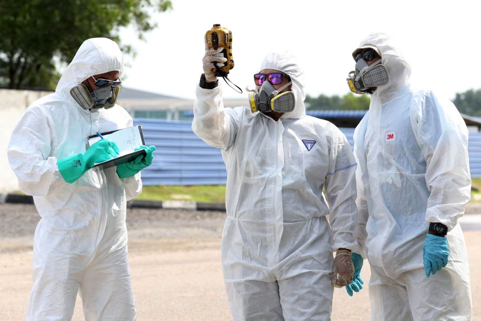 Officials in protective suits checking the air quality in Pasir Gudang on June 25, 2019, after toxic fumes were reported in the area.