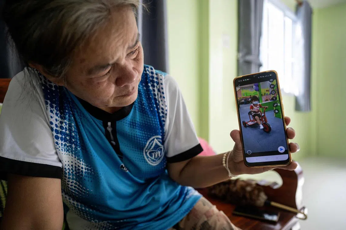 Ms Banyen Srichanil showing a video clip of her three-year-old grandson Nannaphat “Stamp” Songsermin, who was killed in the shooting, in their family home in Nong Bua Lam Phu province.