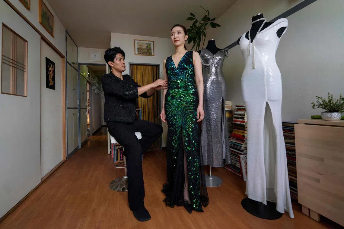 Fashion designer Shibuya Zarny checking the fitting of a dress on a model in his workshop in Tokyo in May 2024.