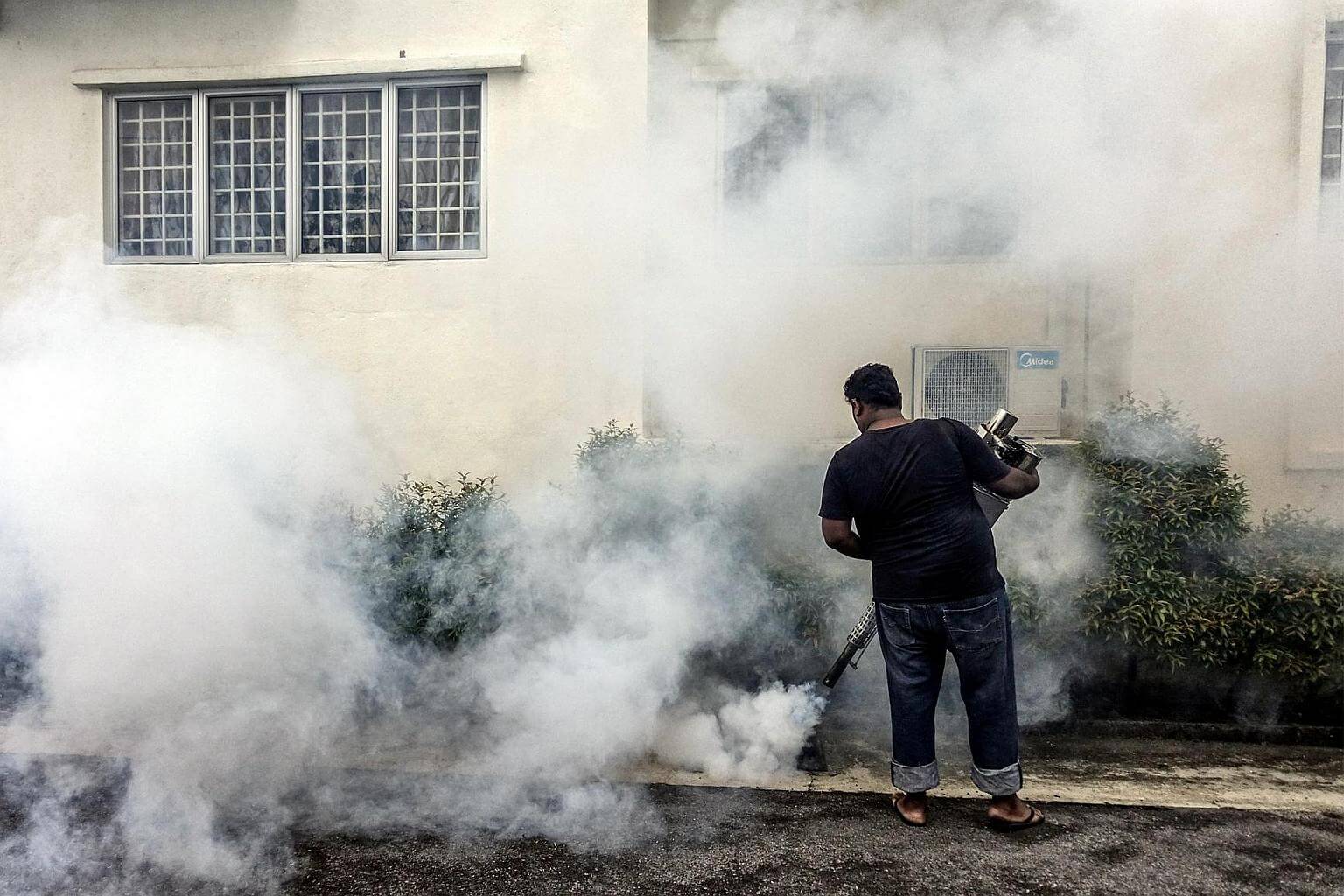 A worker spraying pesticide at an apartment block area in Kuala Lumpur, Malaysia, on Sept 8, 2016.