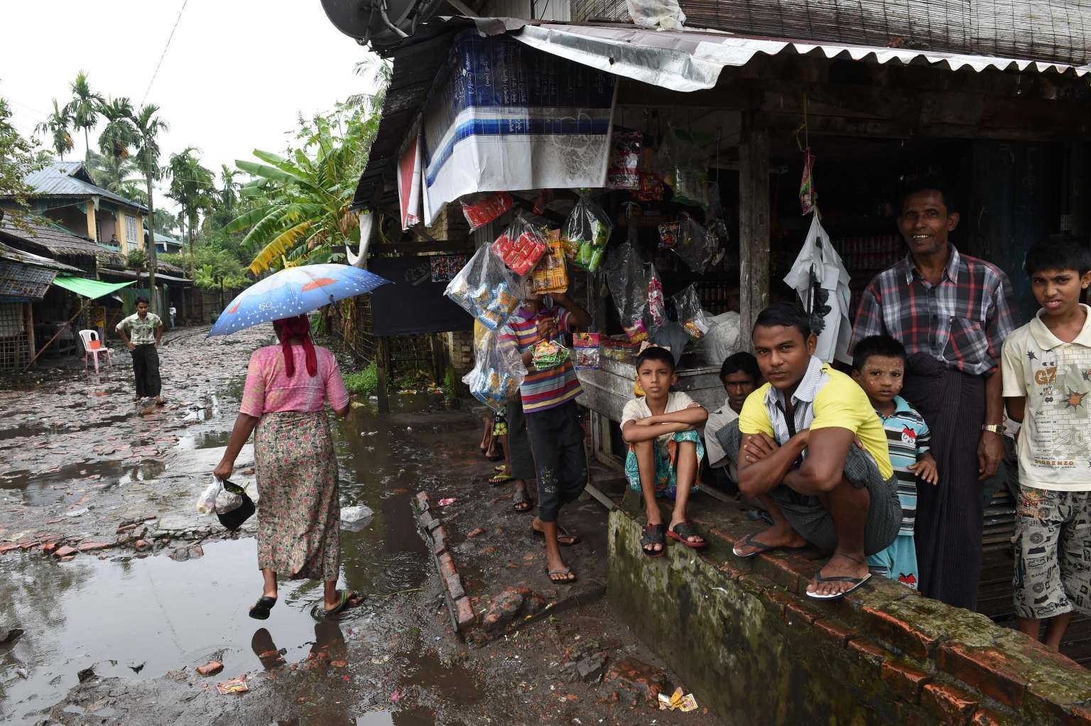 A group of minority Muslim Rohingya gather outside a store at the Aung Mingalar displacement camp in Sittwe on Sept 7, 2016.