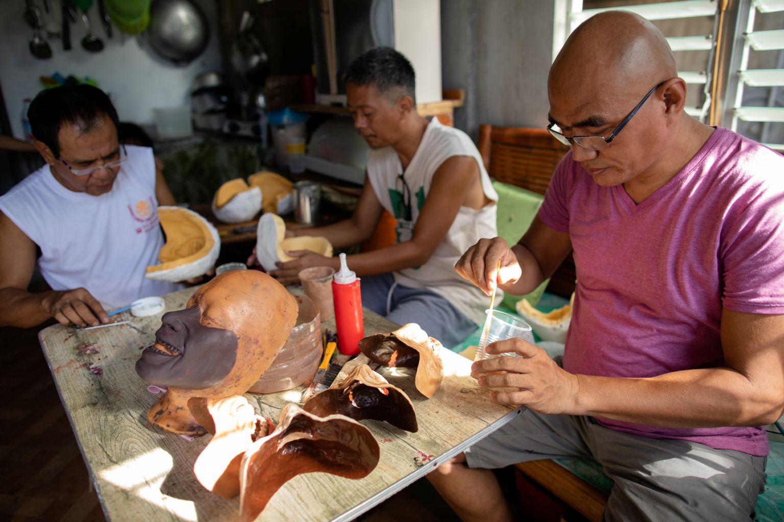 TV prosthetics artist Rene Abelardo (right) mixes paint while his team prepares to mould prosthetic faces.