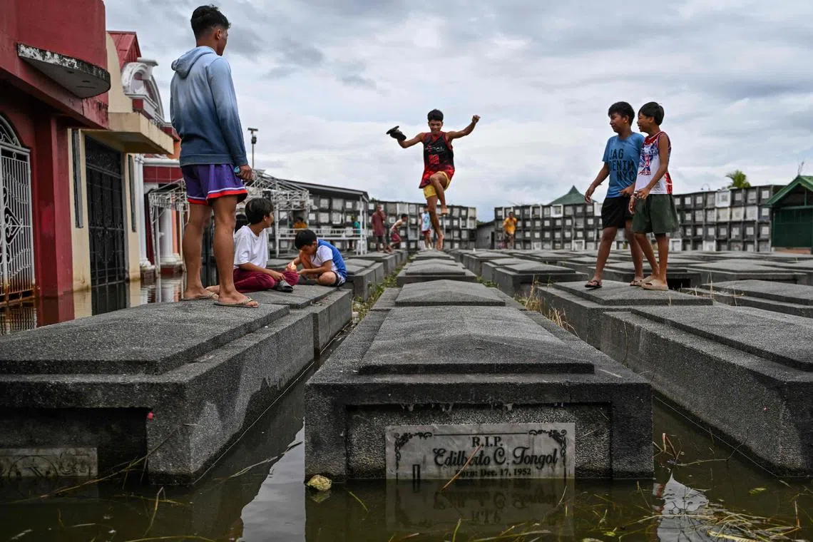 In Pampanga, a low-lying province 80km north of the capital, AFP reporters on Oct 31 saw people trudge through murky floodwaters to visit the submerged Masantol municipal cemetery.