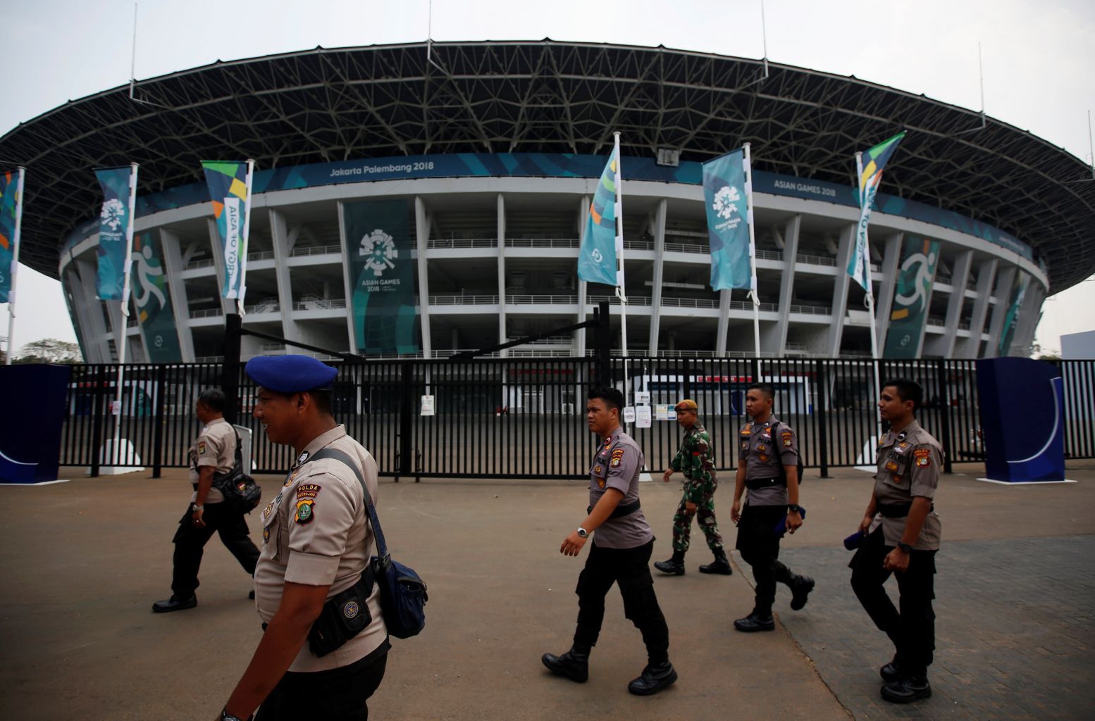 Police officers walking past the front of the main stadium ahead of the Asian Games.