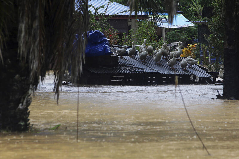 A flock of ducks is seen taking refuge on top of a barn in Kampung Sega Hilir, Negeri Sembilan, on July 13, 2020.