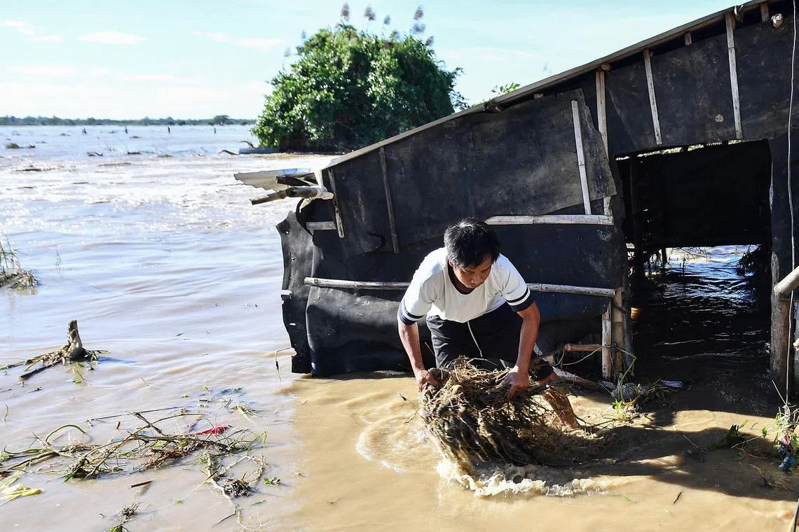 A resident removing grass from his flooded house at a farming village in Aliaga, Nueva Ecija province on Nov 19 after a river dike burst.
