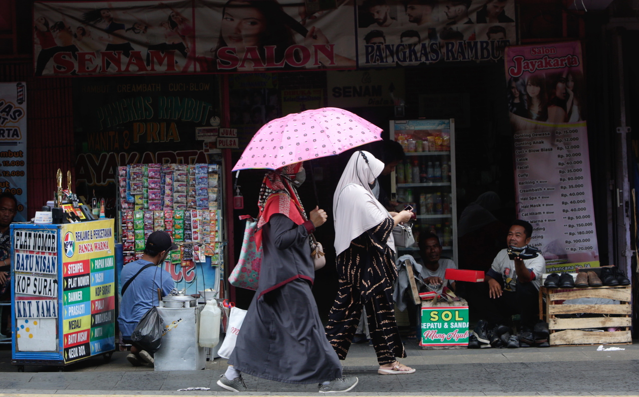 Women walk on front of a store amid the ease of Covid-19 restrictions in Bogor, Indonesia, on Oct 11, 2021.