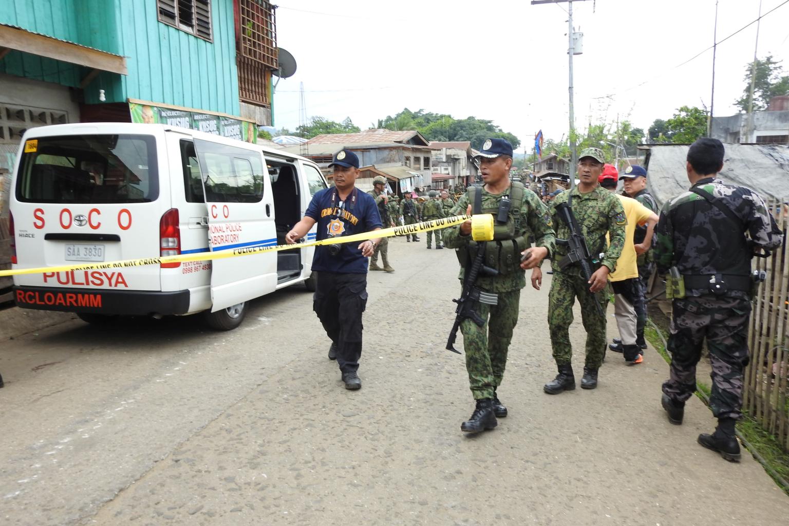 Security forces and scene of the crime operatives cordoning off an area in Indanan town in the Philippines' Sulu province after a blast on June 28, 2019.