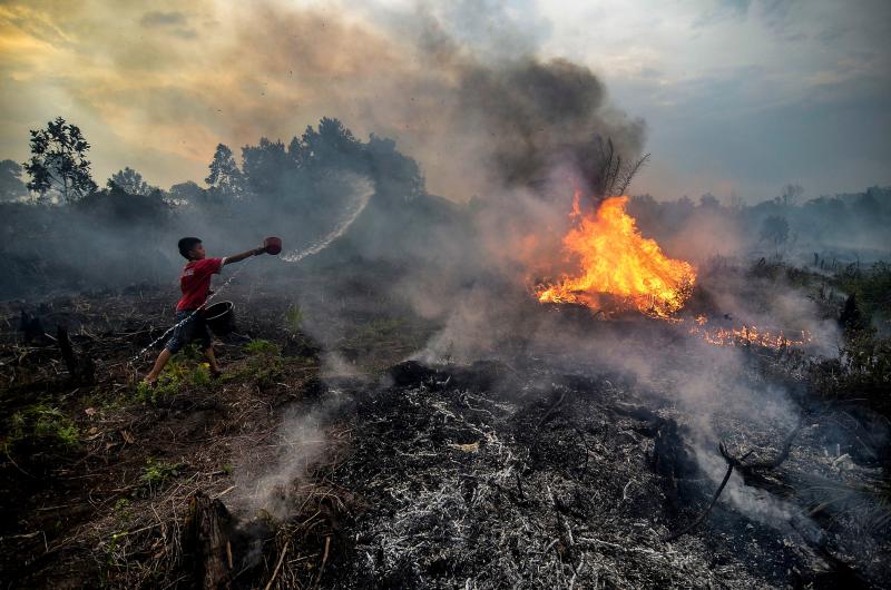 In a photo taken on Oct 4, 2019, a young boy tries to extinguish a fire at a peatland area near his neighbourhood in Pekanbaru, Indonesia.