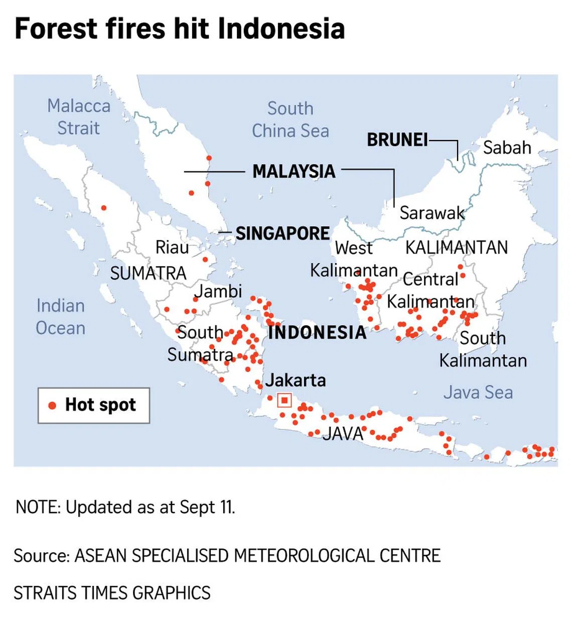 These provinces also had massive fires in 2015 and 2019 due to the prolonged dry seasons, which spread the haze to neighbouring countries including Singapore and Malaysia, affecting their air quality.