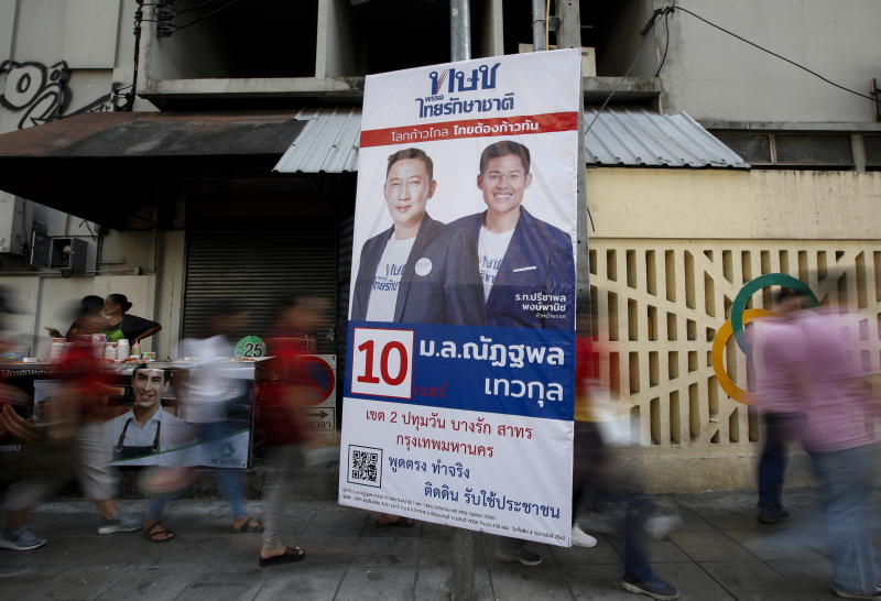 An electoral poster of Thai Raksa Chart Party's leader Preechapol Pongpanich (right) and its party's Member of Parliament constituency candidate in Bangkok on Feb 9, 2019.