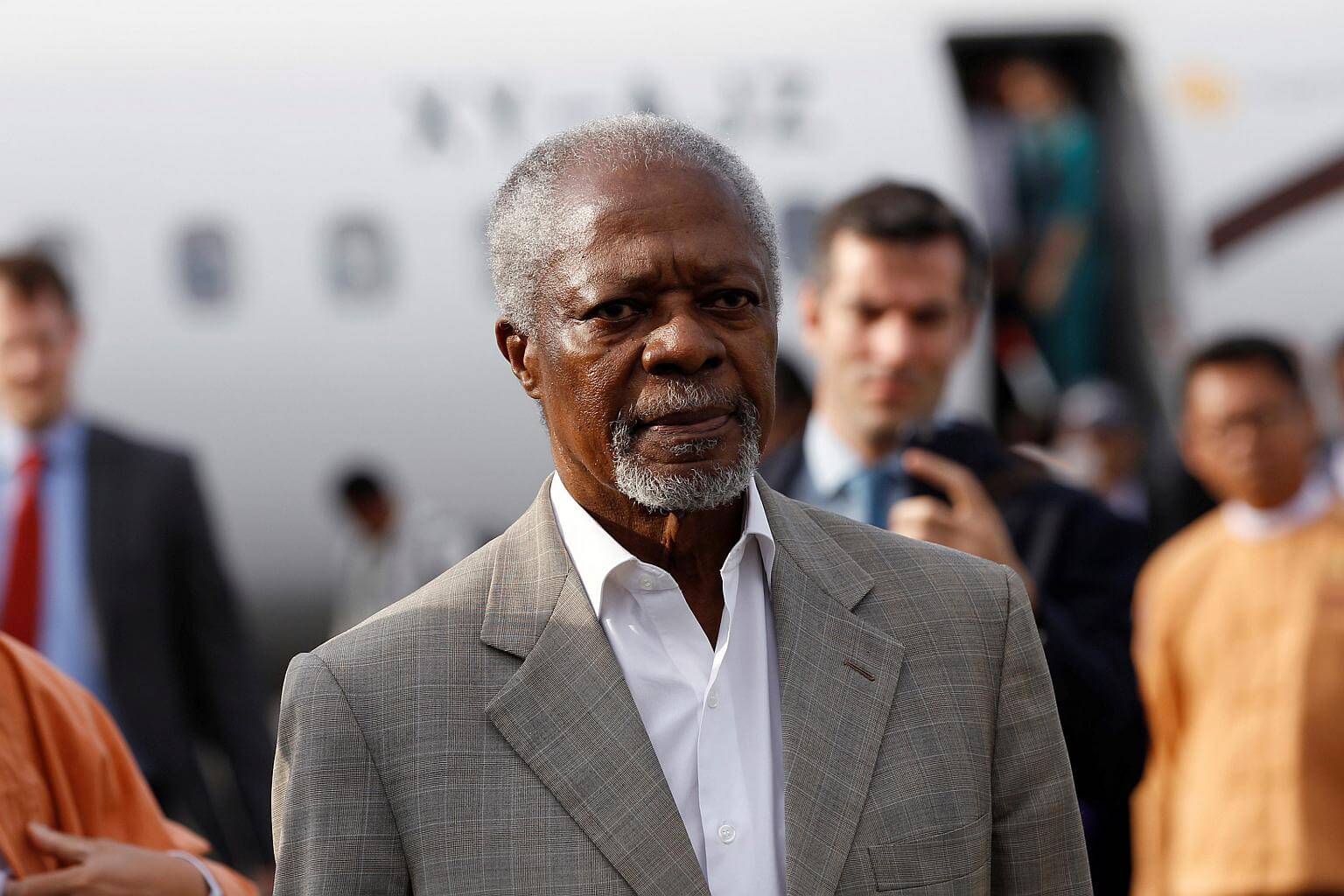 Former UN chief Kofi Annan arrives as he visits in his capacity as Myanmar government-appointed Chairman of the Advisory Commission on Rakhine State, at Sittwe airport, Rakhine state, Myanmar on Dec 2, 2016.