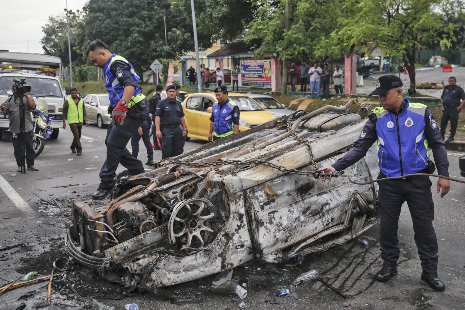 Royal Malaysian Police officers inspect a burnt car that was flipped upside down during the riot at the Sri Maha Mariamman Temple in Subang Jaya, Selangor, on Nov 27, 2018.