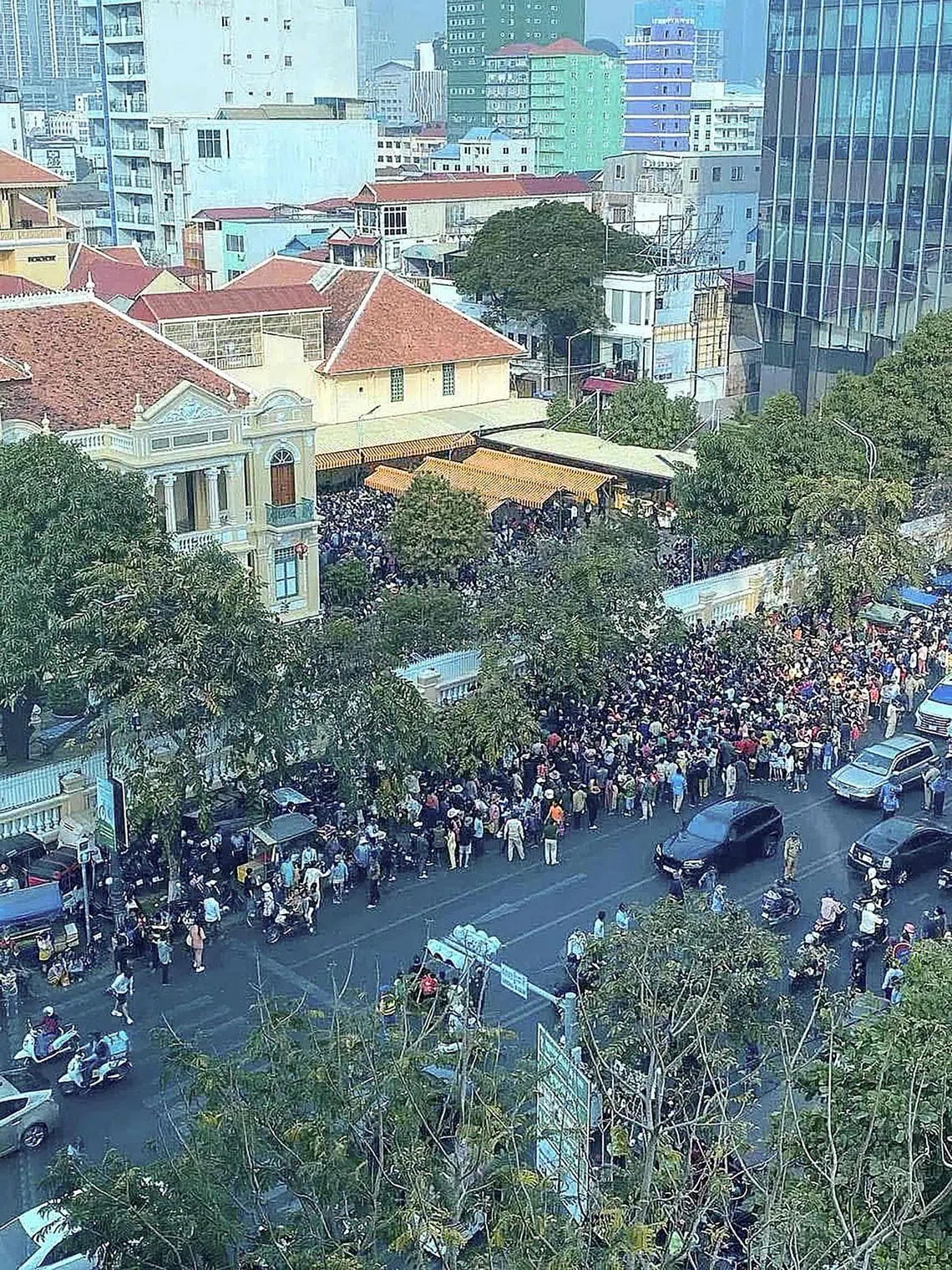 Pictures and footage shared by local media show hundreds of people pushing towards the vast gates of a mansion belonging to Mr Sok Kong.