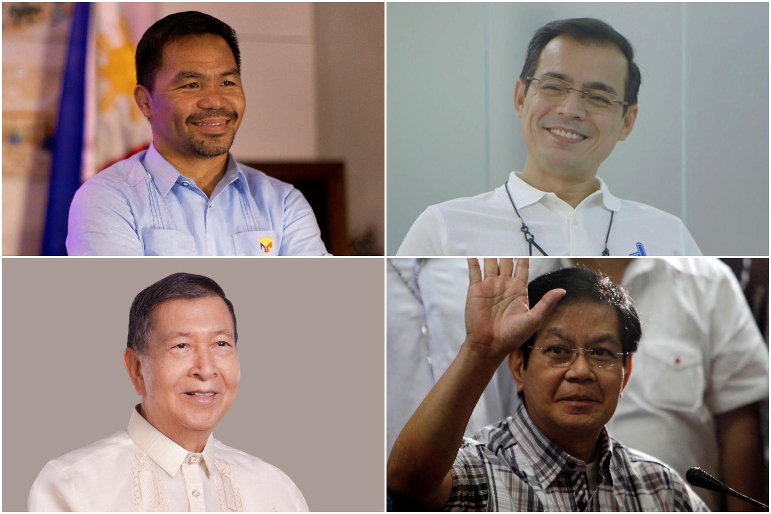 Philippine presidential candidates (clockwise from top left) Manny Pacquiao, Francisco Domagoso, Panfilo Lacson and Norberto Gonzales.