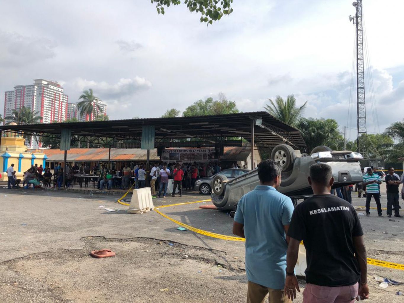 An overturned vehicle lies in front of a Hindu temple after a scuffle between attackers and Hindu devotees in Subang Jaya, Selangor, on Nov 26, 2018.