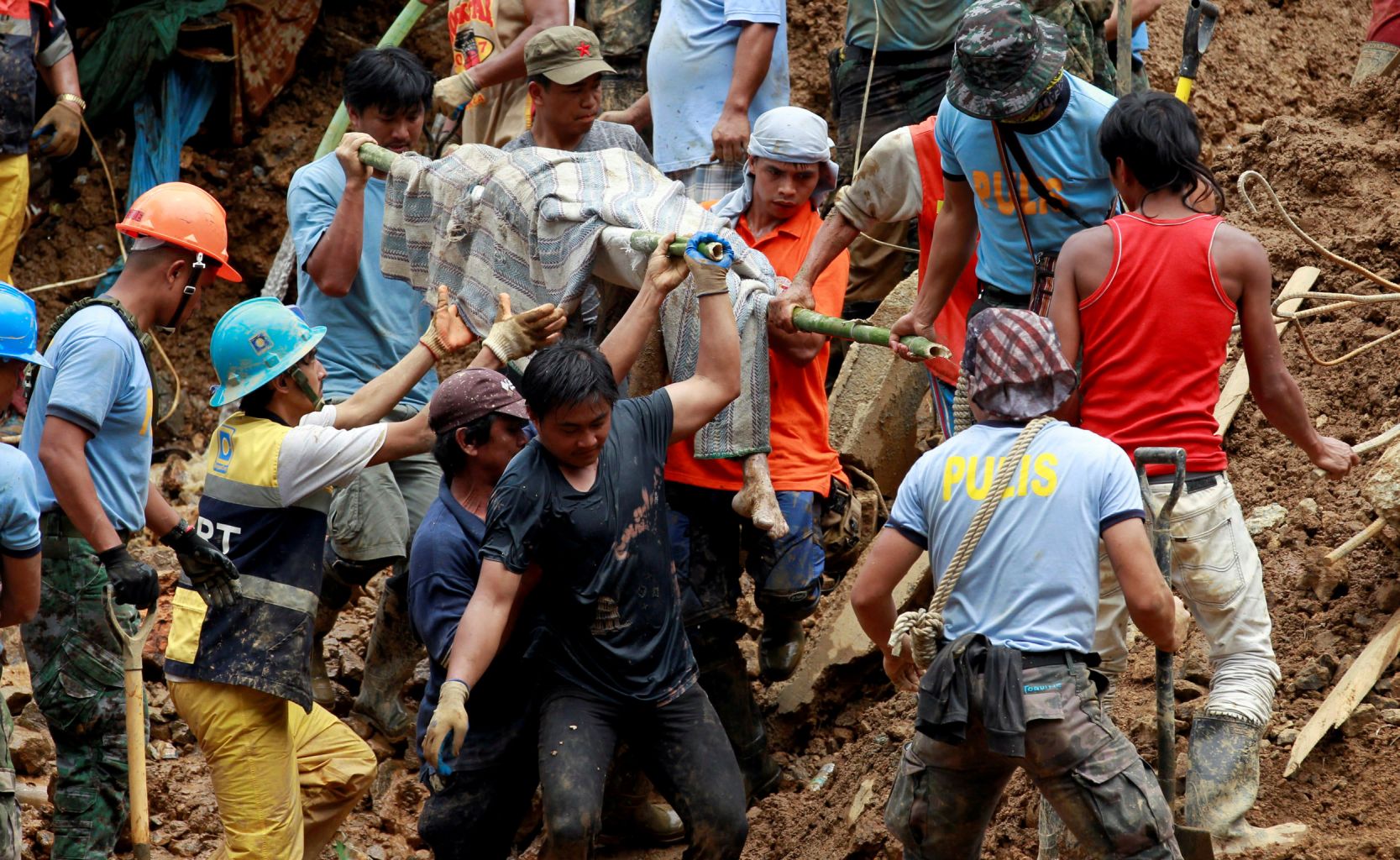 Rescuers carrying a recovered body at a mining camp in Itogon, Bengueta after a landslide was unleashed by super typhoon Mangkhut, on Sept 17, 2018.