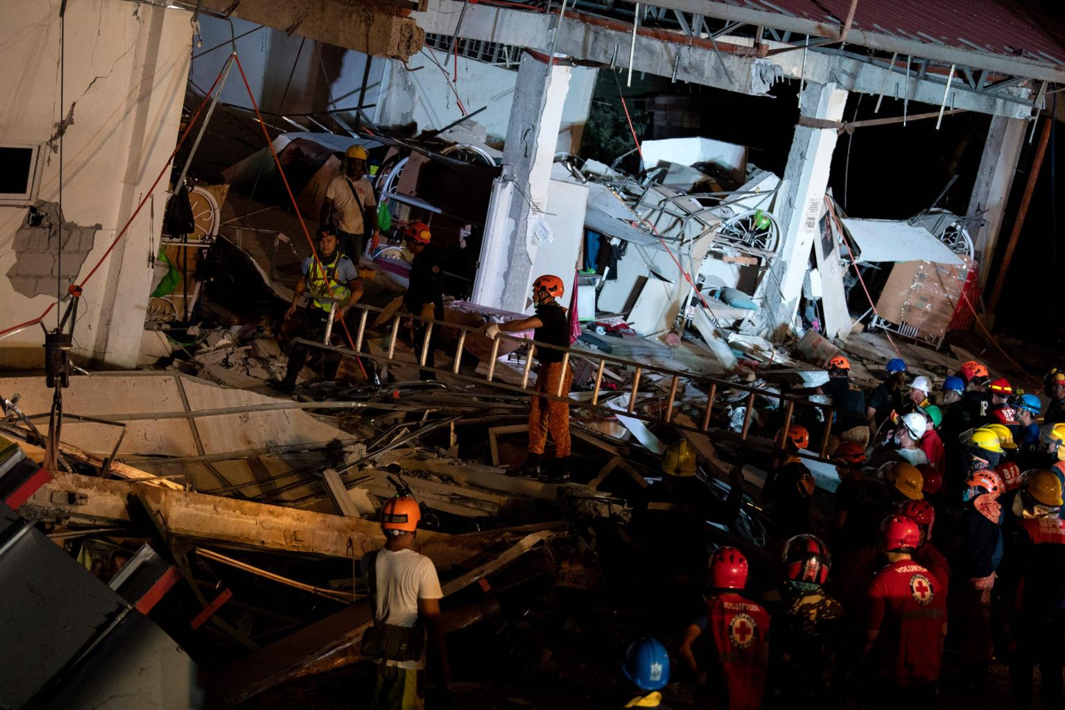 Rescue workers search for survivors in a collapsed Chuzon Super Market in Porac, Pampanga, on April 22, 2019.