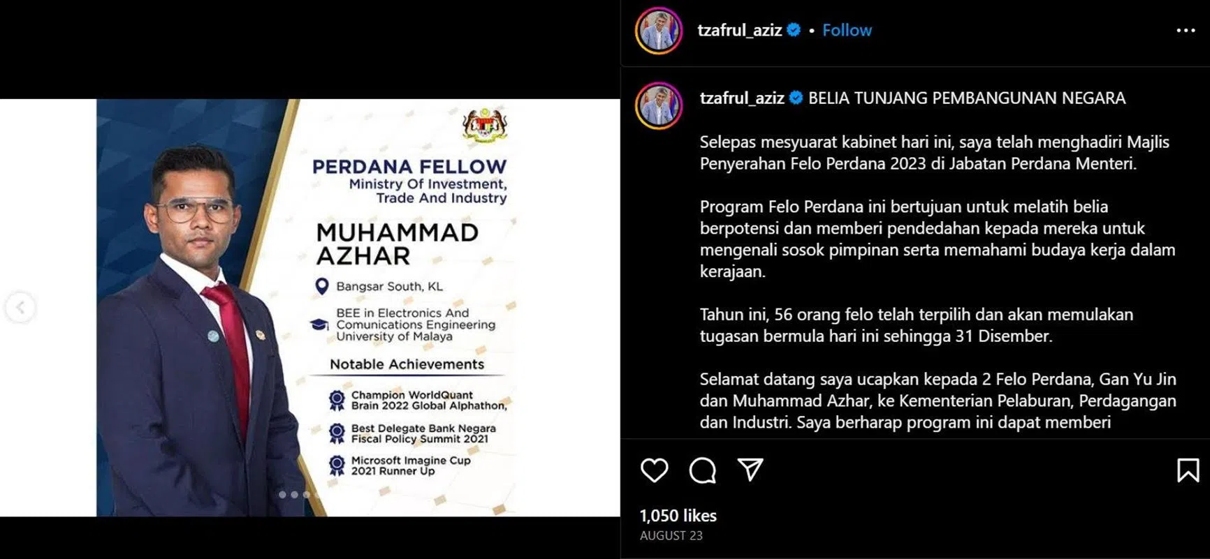 Mr Azhar Ali, 23, was selected as one of 56 Perdana Fellows for 2023 after boasting of being a Universiti Malaya graduate majoring in electronics and communications engineering.