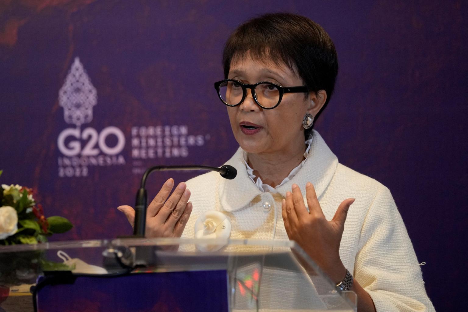 Indonesian Foreign Minister Retno Marsudi delivers a statement after the closing of the G-20 Foreign Ministers’ Meeting in Bali, on July 8, 2022.