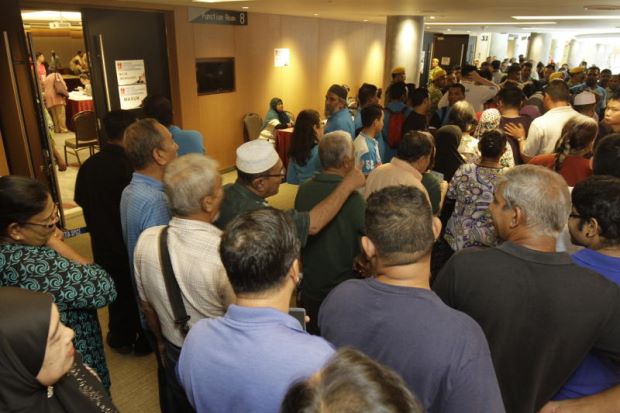 Long lines of people at the Spice Centre, the venue for the Bayan Baru PKR division election, as members waiting to cast their votes are delayed by a problem with the electronic system.