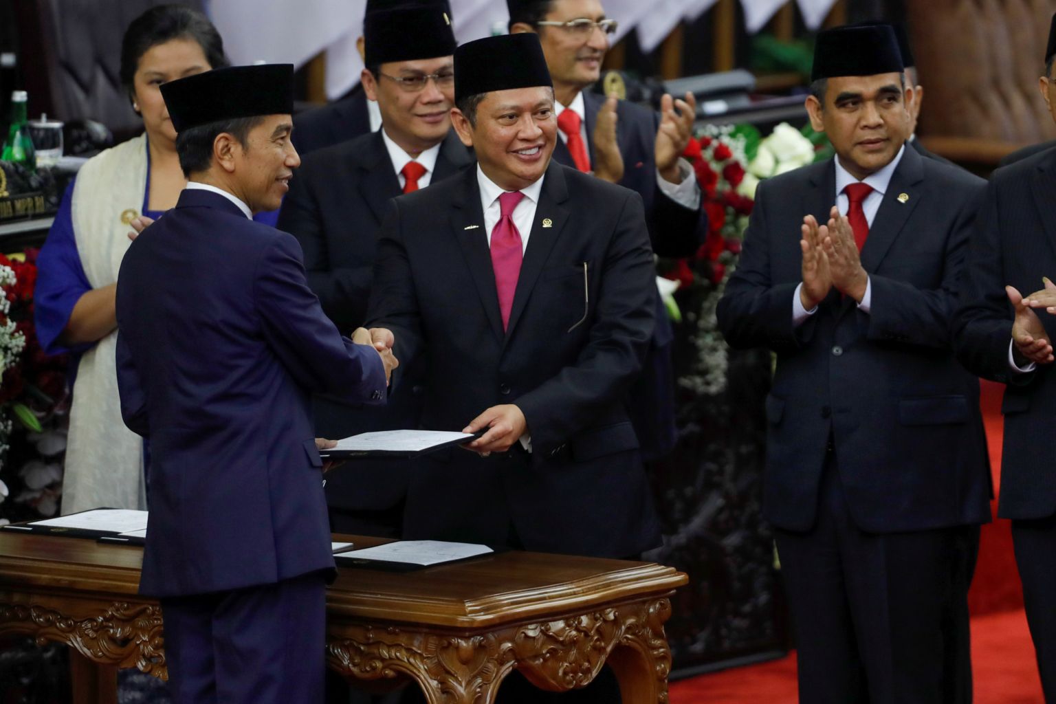 Indonesian President Joko Widodo is greeted by People's Consultative Assembly Speaker Bambang Soesatyo during the presidential inauguration in Jakarta on Oct 20, 2019.