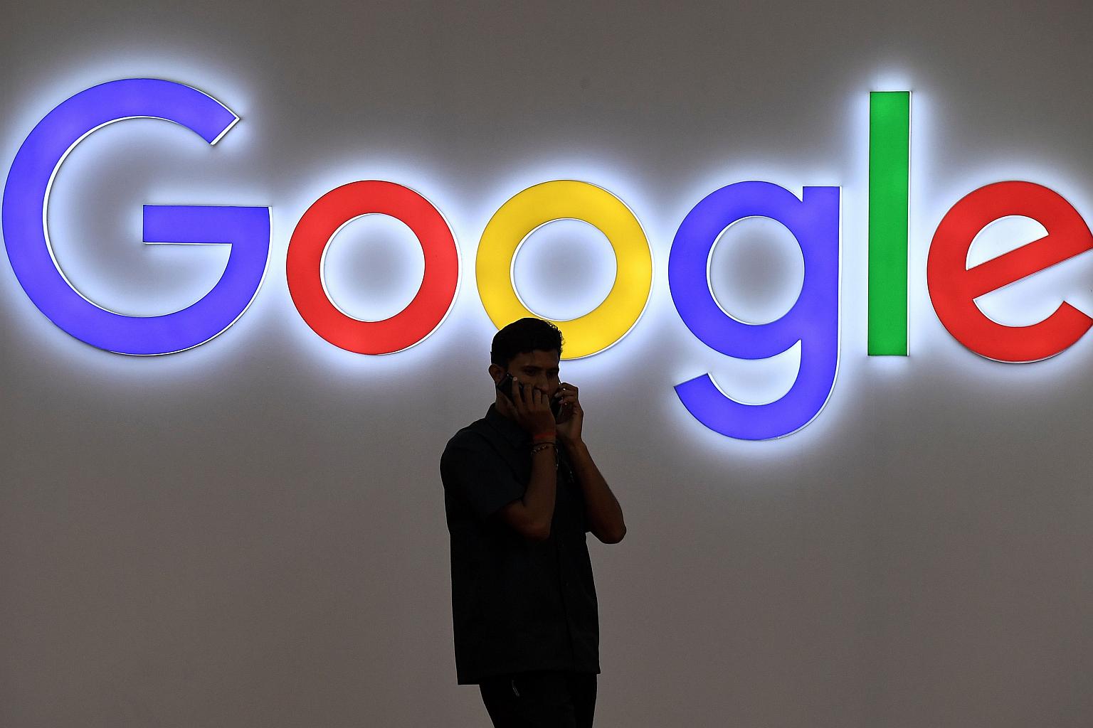 An Indian visitor outside the Google stall at the India Mobile Congress in New Delhi on Sept 27, 2017.