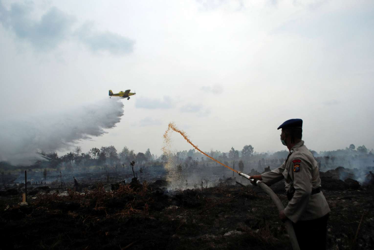A water bomber dropping its payload as a police officer tries to extinguish a peat fire in Kampar, Riau province, on Aug 29, 2016.
