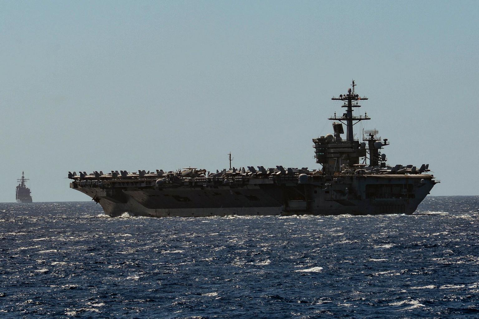 A photo from Feb 29, 2020, shows US vessels USS Theodore Roosevelt and USS Bunker Hill as they transit the Philippine Sea.