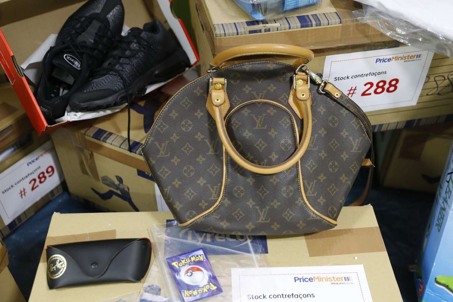 Counterfeit bags and various objects seized by French customs on the fourth national day of counterfeit destruction in Paris on Nov 15, 2016.