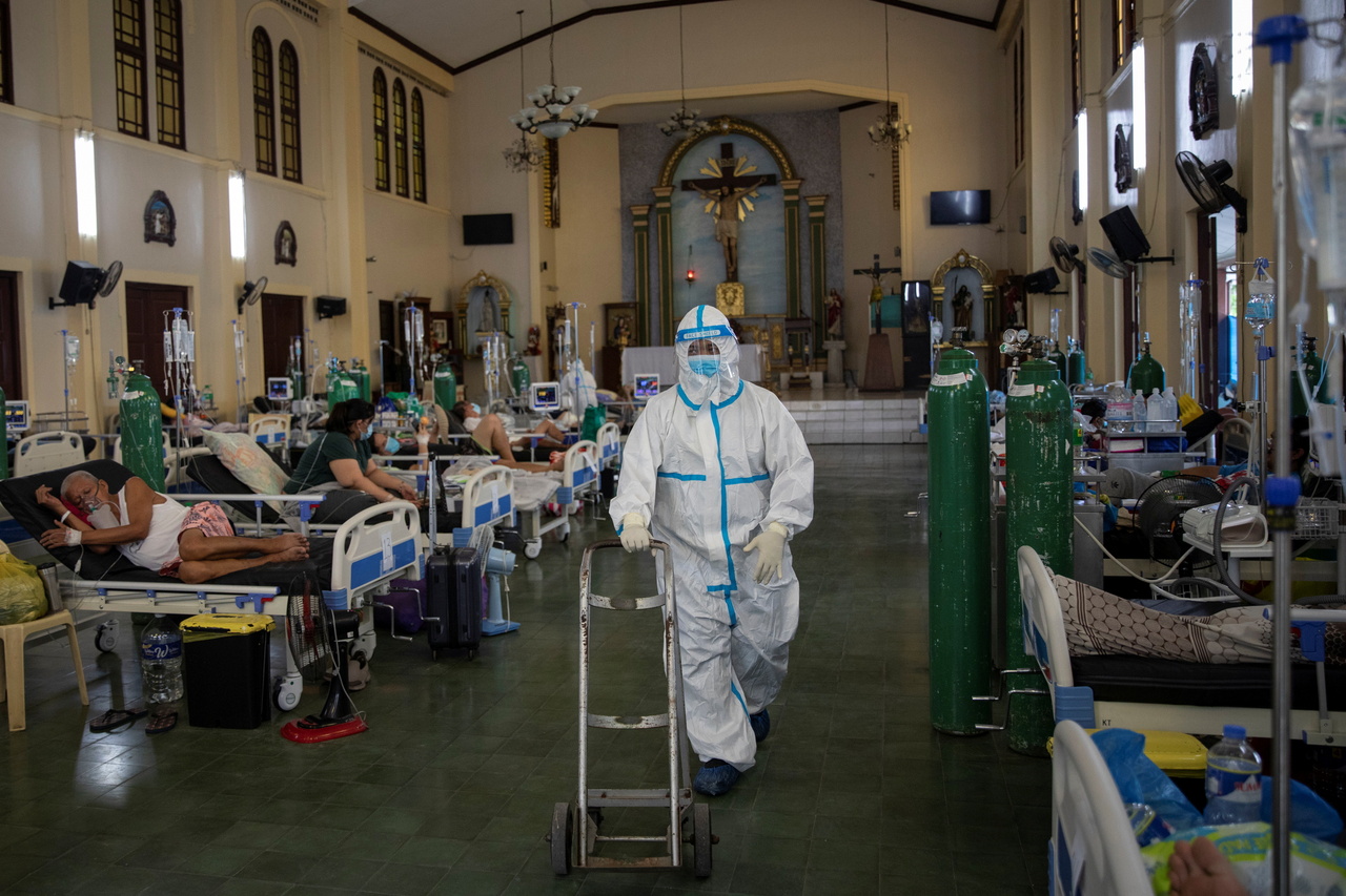 A health worker walks in the chapel of Quezon City General Hospital turned into a Covid-19 ward in Quezon City, Philippines, on Aug 20, 2021.