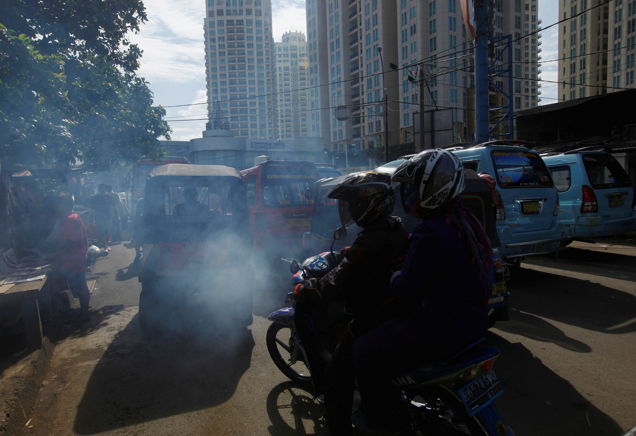 Exhaust fumes are seen coming from a vehicle stopped at traffic lights in Jakarta, on Jan 30, 2012.