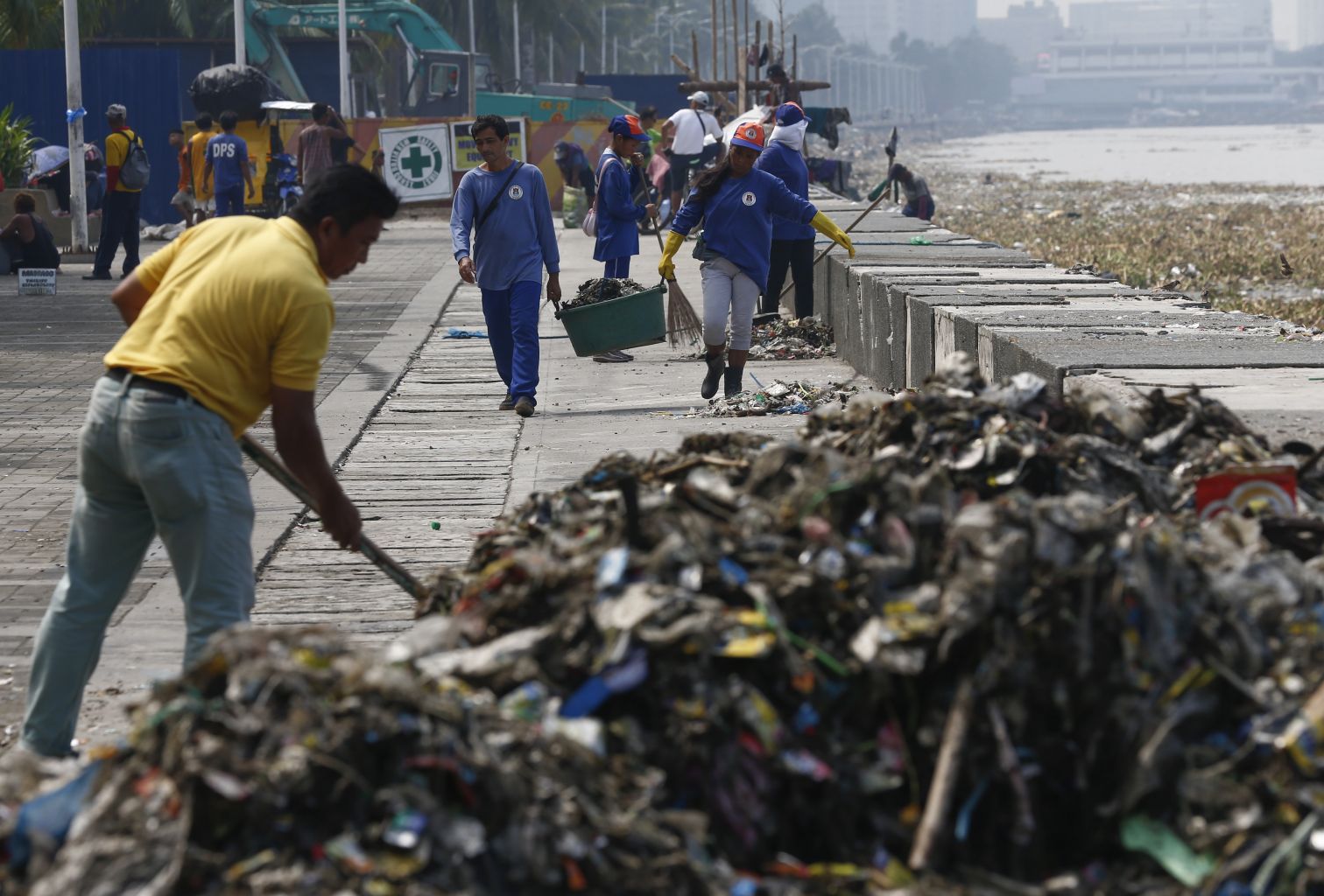 Workers collecting trash and debris along the shore of Manila Bay as part of typhoon precautions in Manila, Philippines, on Sept 13, 2018.