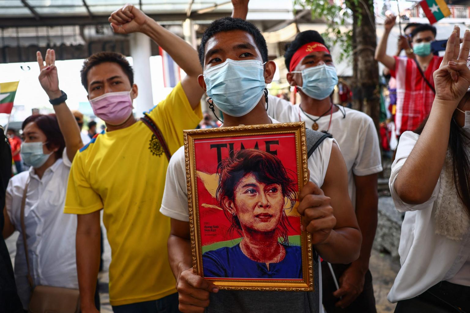 A Myanmar migrant holds an image of detained civilian leader Aung San Suu Kyi during a protest in Bangkok on Feb 28, 2021.