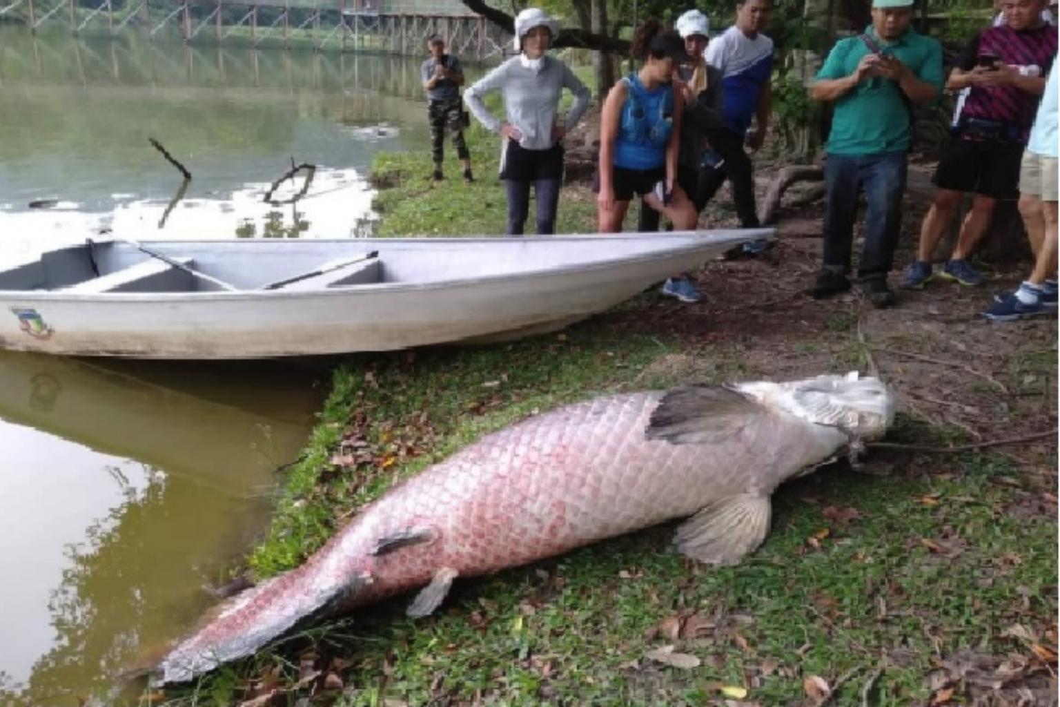 The 108kg fish, measuring about 2.4m in length, was identified as arapaima, a native of the Amazon River.