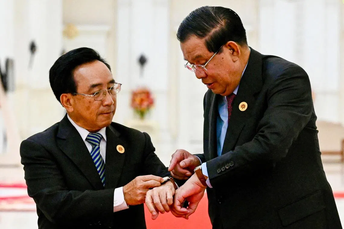 Cambodia’s PM Hun Sen (right) and Laos’ PM Phankham Viphavanh look at watches made in Cambodia in Phnom Penh on Nov 10, 2022.
