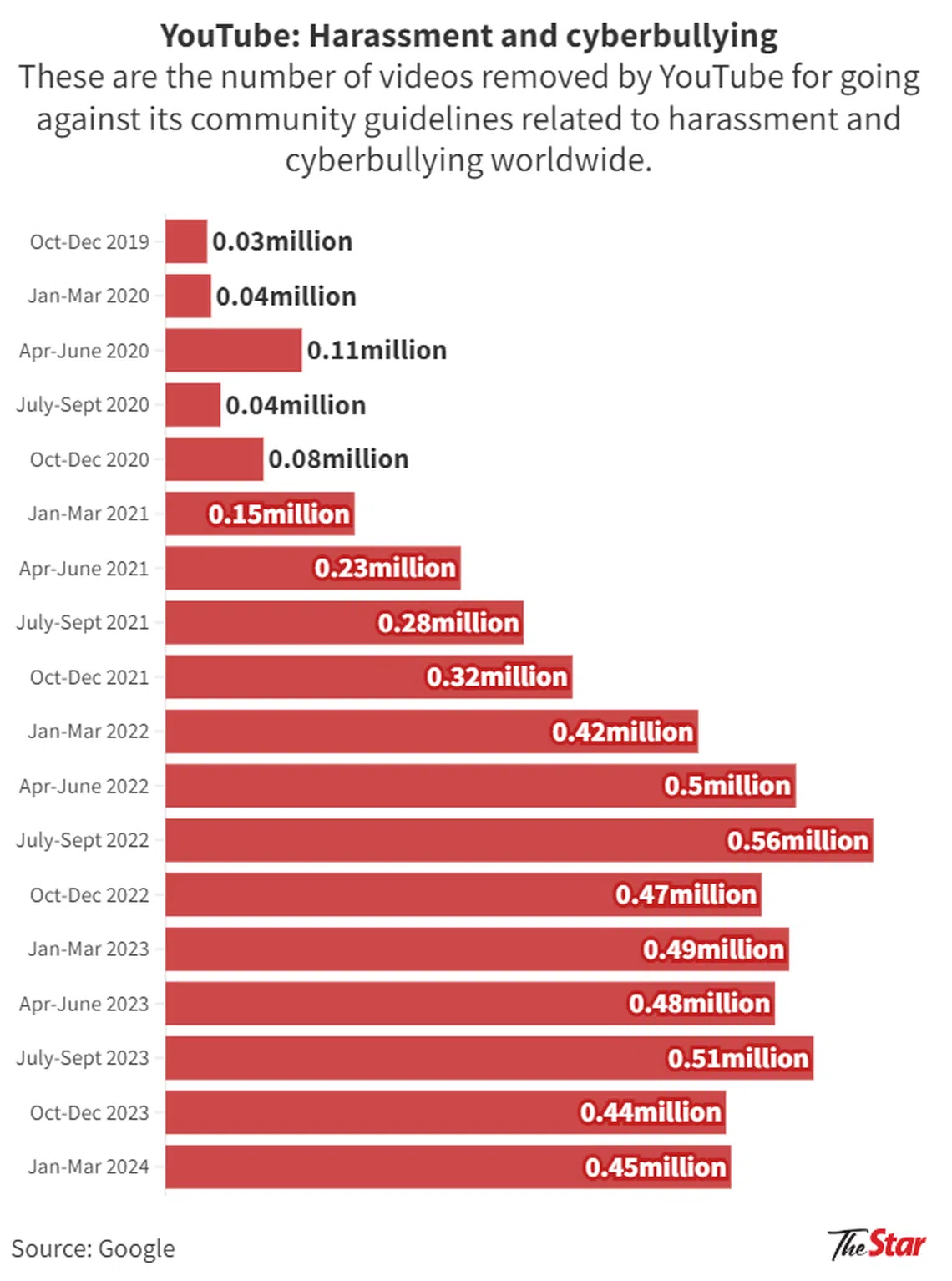 For YouTube, the number of videos removed for harassment and cyberbullying globally had spiked in the past three years – from 149,802 in January to March 2021, to 448,313 in the same period in 2024.