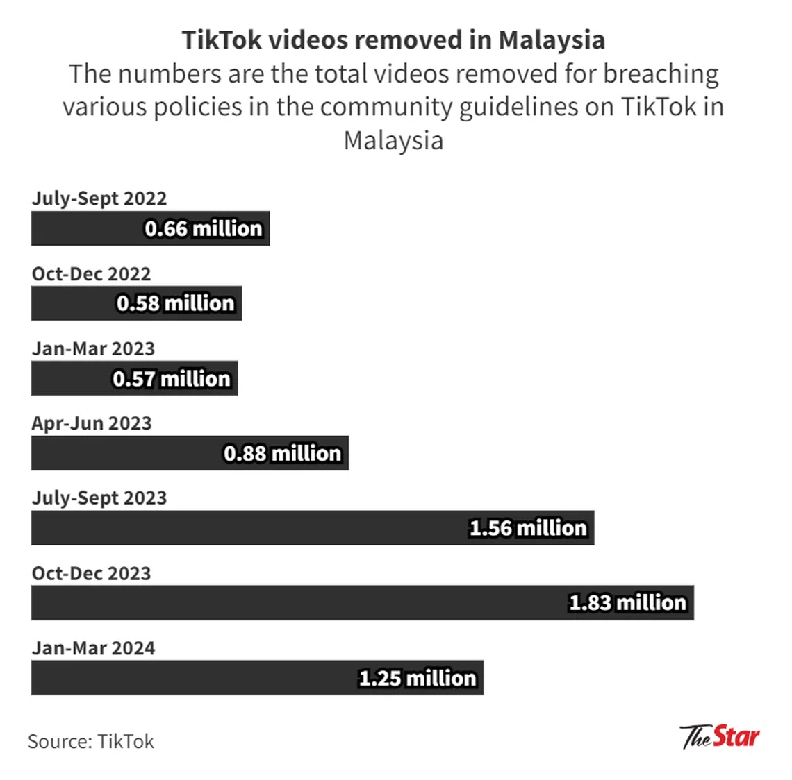 In Malaysia, TikTok removed an overall total of 1.25 million videos from January to March this year that had flouted various policies under its community guidelines.