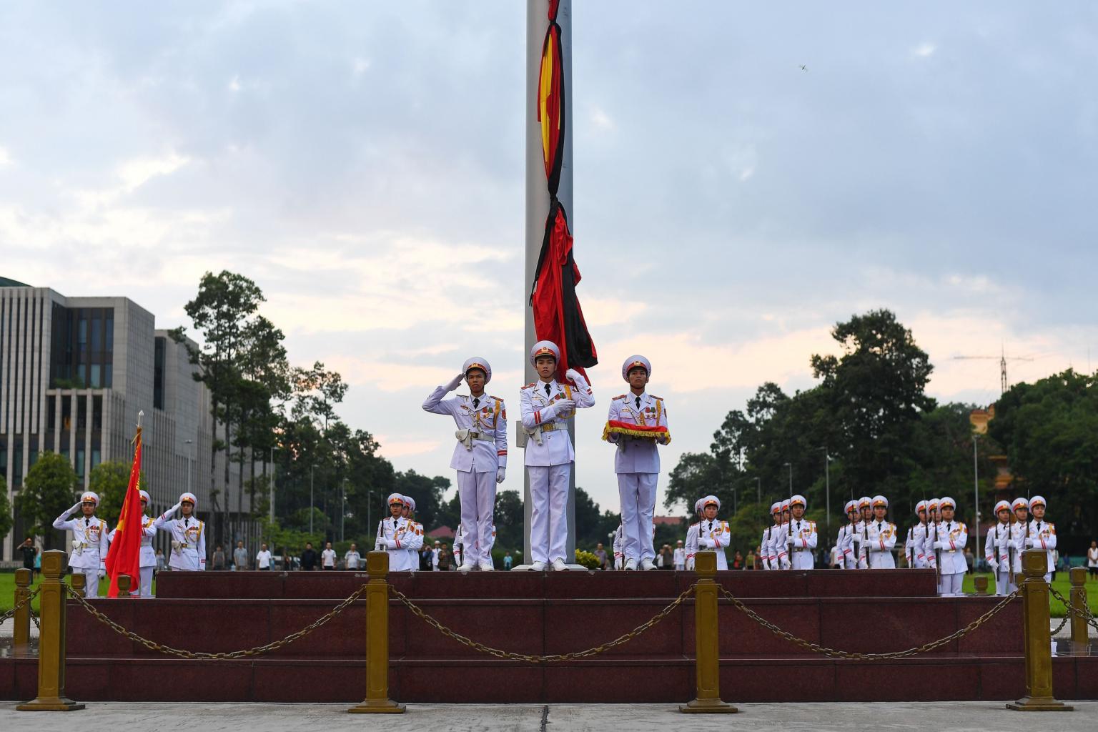 Vietnamese soldiers salute after raising the national flag draped with a black cloth to pay their respects to the late President Tran Dai Quang at a state funeral in Hanoi, on Sept 26, 2018.