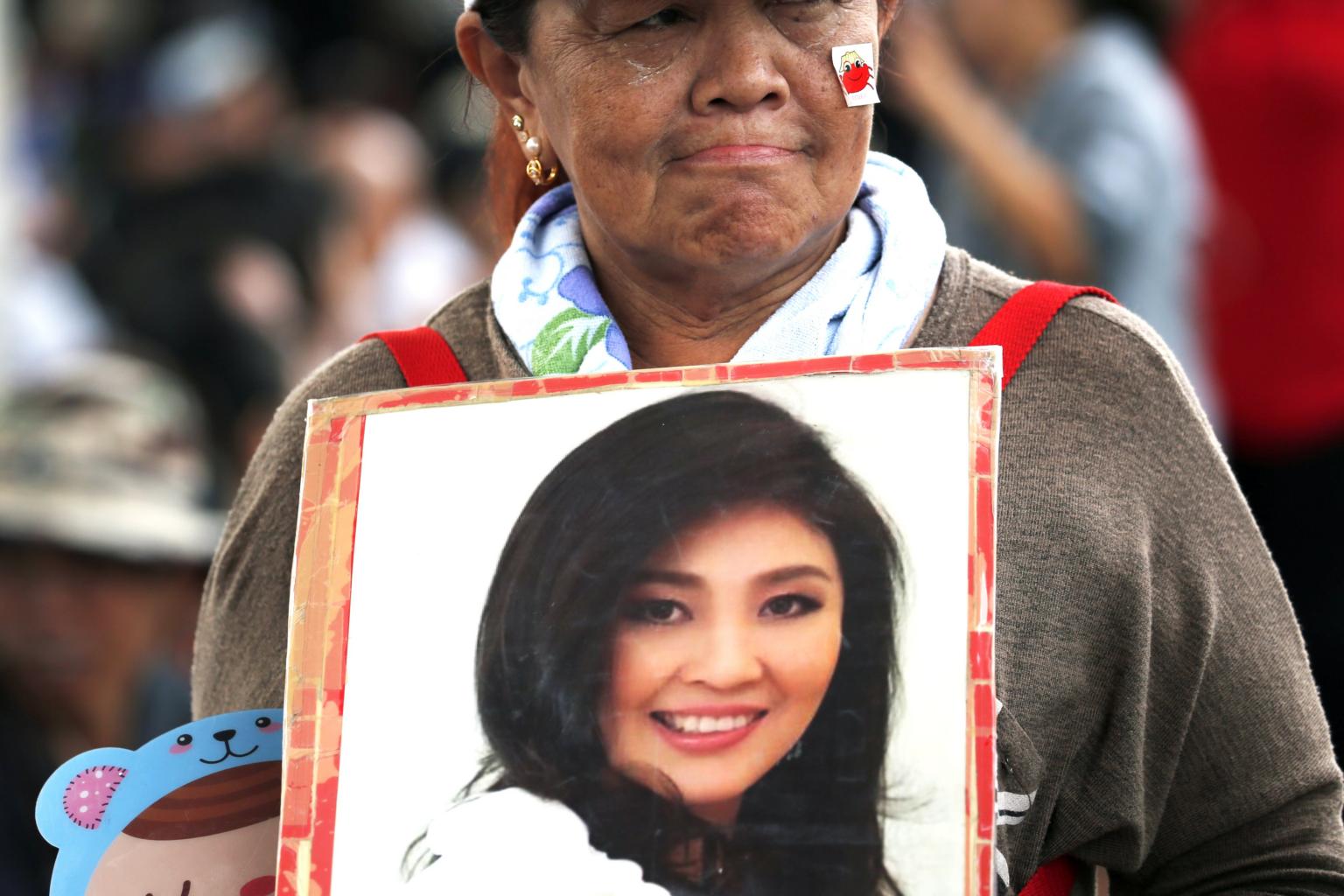 A supporter holds a photograph of former prime minister Yingluck Shinawatra after she failed to appear to hear her verdict at the Supreme Court's Criminal Division for Persons Holding Political Positions in Bangkok, on Aug 25, 2017.