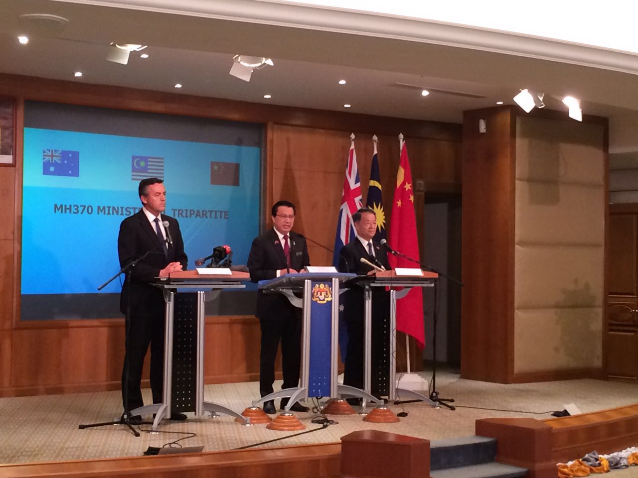 Malaysian Transport Minister Liow Tiong Lai (centre) speaks at the press conference in Kuala Lumpur on July 22, 2016, with his counterparts from Australia and China.