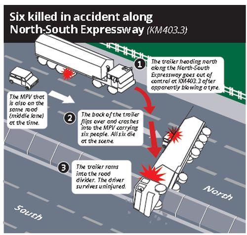 The six died after their multi-purpose vehicle (MPV) was crushed by a trailer along the North-South Expressway near the Tanjung Malim toll plaza on Sunday (April 2). The trailer was driven by a man with a record for drug and road offences.