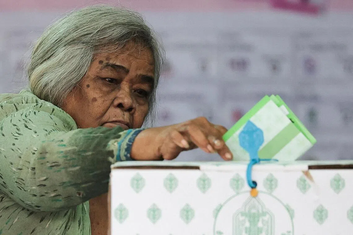 A voter casting her ballot at a polling station in Buriram province, Thailand on Feb 8.