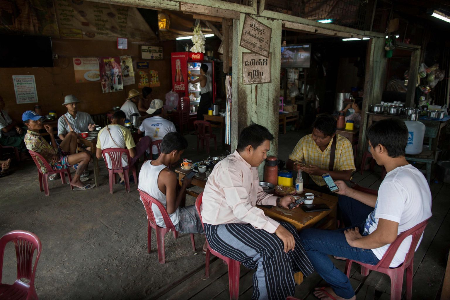 Myanmar people gather for refreshments at a teashop in Yangon, where many hangout to chat and browse Facebook with their mobile phones, on Aug 31, 2018.